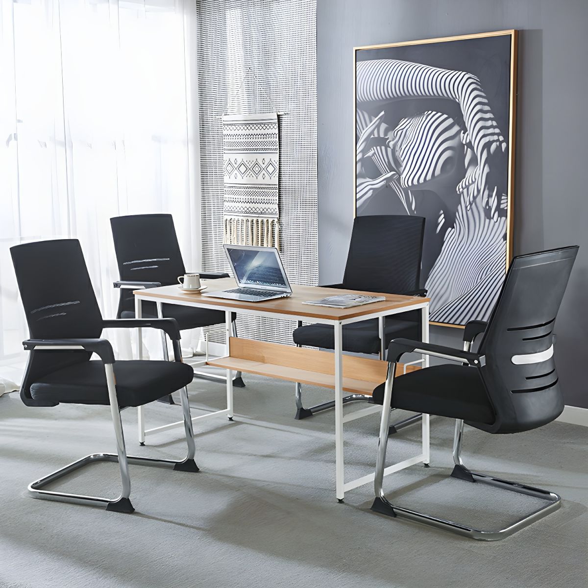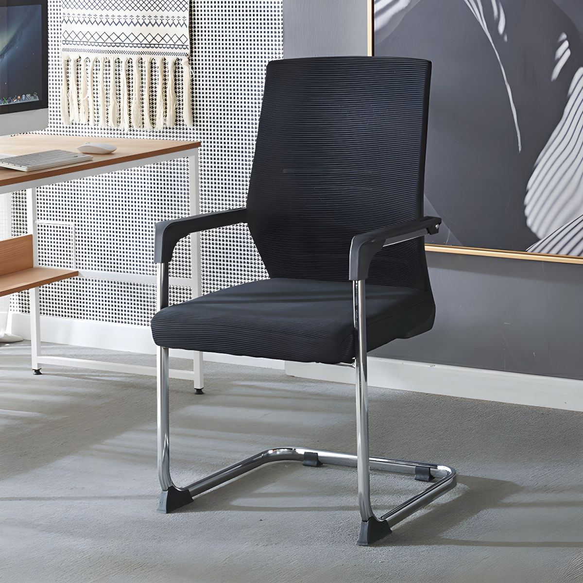 The visitor’s mesh chair is ergonomic in shape for a healthy posture. It has a generously proportioned posture curved backseat for comfort and relief. Also has a cantilevered chrome tube base along with adjustable lumbar support. Available in the black seat fabric.