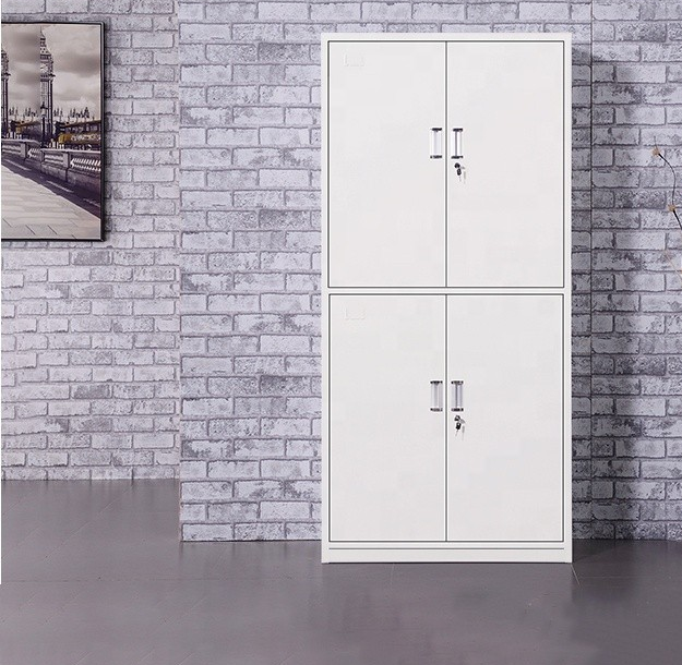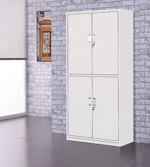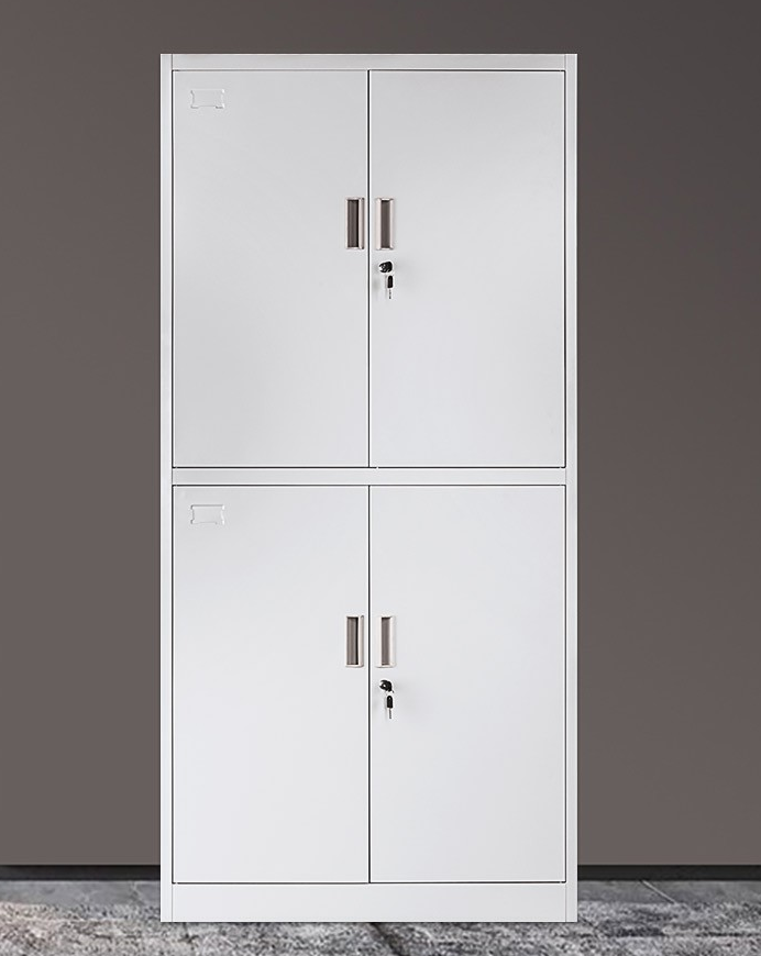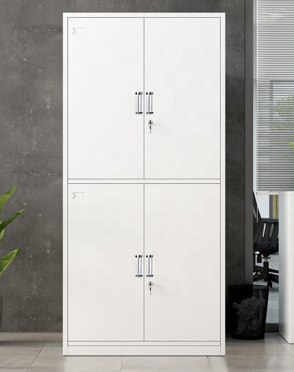 Alt: “White steel storage cabinet with lockable doors for office organization”